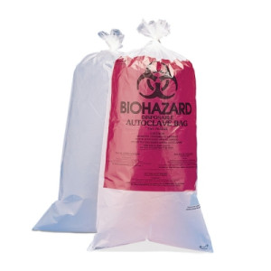Low cost, reliable waste disposal. Made of virgin-grade polypropylene, these translucent bags can be used for the safe disposal of used pipettes, petri dishes, culture plates, membrane filters and more. Biohazard Disposal Bags can be autoclaved at a maximum of 135°C (275°F) and discarded. The bags are 1.5 mil thick and are made from material which meets or exceeds the dart-impact test requirement of 165 grams per ASTM D1709-85. Biohazard Disposal Bags are also available with a printed sterilization patch that darkens when subjected to steam sterilization. The bags are printed with the standard biohazard warning symbol and precautionary procedures in four languages, English, French, German, and Spanish.