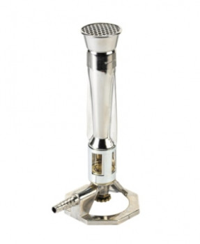 For use where extremely hot flame is needed. Meker type burner prevents backflashing. Cap forms short, small, uniform blue cone. Produces heat output in excess of 12,000 Btu/hour. Complies with Federal Specification NNN-B-795. 8-1/2" high with heavy die-cast base.
