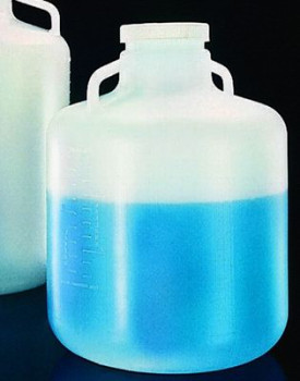 Nalgene™ low-density polyethylene carboys with white polypropylene screw closures. Convenient wide-mouth opening for solids, powders and overhead mixers. Same material benefits as Cat.No. 7-2210 series carboys but with 100mm closure. Graduated to contain in 1 gallon and 5 liter increments. Leakproof.