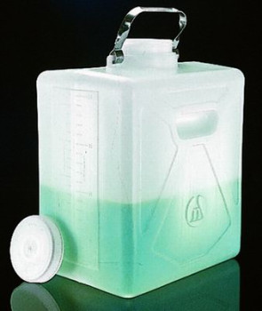 Nalgene™ high density polyethylene carboy with polypropylene screw closure in a sturdy, space-saving rectangular design. Features molded-in graduations in liters and gallons. Built-in shoulder loops have convenient stainless steel bail handle attached. Wide-mouth opening for easy filling, transferring, cleaning. Leakproof. Closure size is 100mm.