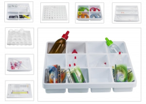 These white polystyrene plastic trays measure 36 x 44.5 x 5.7cm (14 x 17½ x 2¼") and fit standard lab bench drawers. They're a practical and functional solution for organizing the "stuff" of daily lab life. Various configurations are available to accommodate thermometers, medication cups, jars, stir bars, vials, and/or pipettes.