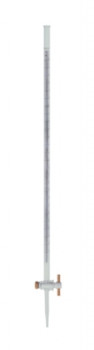Kimax® Schellbach buret with a filling tube at the stopcock and an overflow tube at the top of the buret that accept 1/4 inch I.D. flexible tubing. Employs a blue line on a broader white band running vertically behind the scale to create an optical effect which causes the meniscus to assume an apparent form. An automatic or self-zeroing buret must be read only at the apparent meniscus for which it has been calibrated when volumes are dispensed from zero to any other point. Use of true meniscus in this case would result in a lesser volume being dispensed than between any two other points of the same nominal volume. For greater accuracy, however a "buret reader" should be used to eliminate the exaggerated parallax problems. Stopcock for all sizes is PS 2. Scale is durable black ceramic enamel. Replacement stopcock is 6-41530F-2.