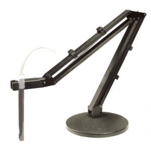 Speeds up batch sampling and reduces probe breakage. Ideal for multiple conductivity or pH readings. Fingertip control raises, lowers, and pivots (360°) the perfectly balanced electrode holder wherever desired. Moves in all directions, holds electrodes safely and securely in any selected position. Electrode arm articulates at three points so the electrodes always remain vertical. It is designed to accept any standard glass, reference, combination or other electrode-a temperature probe or conductivity probe. Weighted die-cast metal base and spring counterbalance permit fluid movement with superior stability. Complete with 21" metal arm, 8" diameter metal base, and probe holder. Weighs six lbs.