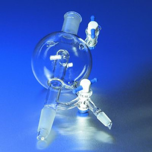 This Pyrex® solvent still head is used for maintaining oxygen free solvents. Head has sufficient storage space to allow solvent removal by syringe or drainage through 2mm T-bore PTFE stopcock. It has a 24/40 Standard Taper outer joint at top, 24/40 Standard Taper inner joint at bottom and 14/20 Standard Taper inner joint on drainage arm.