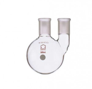 Round-bottom distilling flasks with heavy walls. Flasks have two vertical necks with ST outer joints on both.
