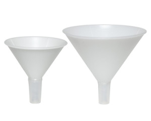 Polypropylene funnels with standard taper stems (24/40). Funnels are specially designed for transferring powders and are steam autoclavable at 121° C (250° F).