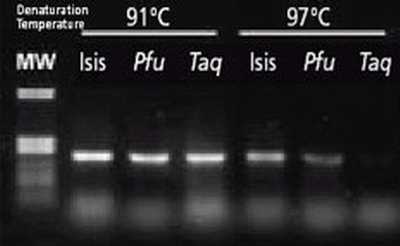 Isis DNA Polymerase is the most thermostable proofreading polymerase available (80% of the activity remains after 5 hours incubation at 95°C and 50% after 5 hours at 100°C) and therefore will retain more activity during PCR, giving more product. This also means denaturation time and temperature can both be increased if necessary (see Fig. 2), e.g., for reading through difficult secondary structure.