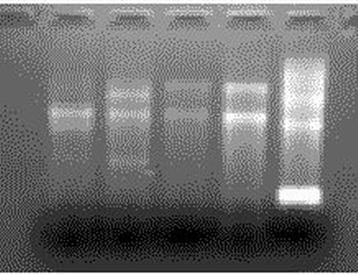 Bacterial total RNA extracted with the FastRNA Pro Blue Kit. Approximately 2% of the total RNA isolated from 1010 bacterial cells was loaded on to a 1.2% denaturing agarose gel (1X MOPS). Lane 1: Salmonella typhimurium; Lane 2: Pseudomonas stuartii; Lane 3: Escherichia coli; Lane 4: Bacillus subtilis; Lane 5: 0.24-9.5kb RNA Ladder.