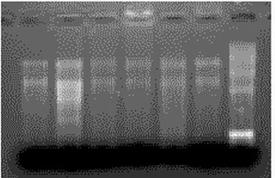 Plant total RNA extracted with the FastRNA Pro Green Kit. Approximately 2% of the total RNA isolated from 100 mg tissue was loaded on to a 1.2% denaturing agarose gel (1X MOPS). Lane 1: wheat seed; Lane 2: tomato leaf; Lane 3: red soybean seed; Lane 4: oat seed; Lane 5: iceplant leaf; Lane 6: barley seed; Lane 7: 0.24-9.5kb RNA Ladder.