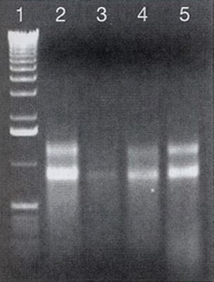 Total RNA extracted from Soil Samples with the FastRNA Pro Soil-Direct Kit. Approximately 15% of the total RNA isolated from 0.5 g of four different soil samples was loaded on to a 0.8% agarose gel. Lane 1: 1kb ladder, Lane 2: Soil #1, Lane 3: Soil #5, Lane 4: Soil #10, Lane 5: Soil #11.