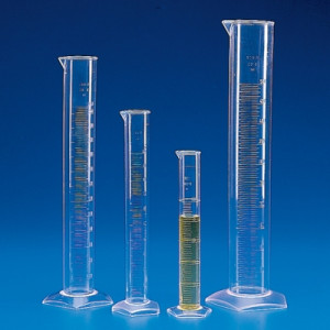 Superior quality graduated cylinders are ideal for the safe and accurate measurement of all types of liquids. Cylinders have a wide rim and tapered pour spout for easy filling and pouring. The non-wetting interior surface eliminates concave menisci, providing more accurate measurements. A wide pentagontal shaped base provides stability and makes the cylinder roll-resistant. The heavy duty plastic withstands repeated autoclaving. Cylinders are chemically resistant to most acids, bases, and many common solvents.