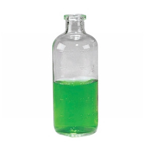 These bottles are manufactured from Wheaton "400" borosilicate glass (meets USP Type I standards). Raised graduations indicate approximate capacities in milliliters. Bottles accept standard stoppers and seals.