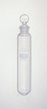 These 50mL Pyrex® round bottom, nongraduated centrifuge tubes have a No. 13 Standard Taper solid glass pennyhead stopper. Rockefeller Institute of Medical Research type.