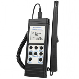 Maintain accuracy with do-it-yourself calibration. Traceable® Memory Hygrometer/Thermometer measures from 10.0 to 95.0% relative humidity and temperature from 0.0 to 199.9°F and –18.0 to 93.0°C. Precision thermistor offers a temperature accuracy of ±1°C between 0 to 40°C, otherwise ±2°C, and a resolution of 0.1°. Reads Fahrenheit and Celsius. An audible click confirms each key entry. See listing for dew point model specifications.