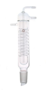 Water inlet and outlet located above ring-sealed inner condensing tube. Has Standard Taper inner drip joint and side outlet for drying tube, etc. Molded inner cold finger. Used primarily in reflux mode and Soxhlet extractions.