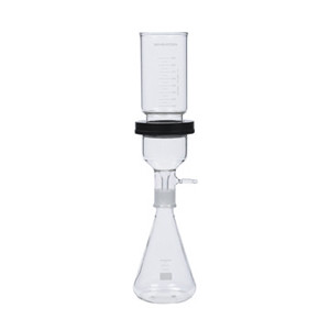 Recommended for large sample volumes, liquids with a heavy particulate load and viscous liquids when a high flow rate is required. Can provide filtration rates up to four times faster than 47mm assemblies due to its larger filter area. Feature a unique screw collar design for connecting the funnel to the support base providing a more even seal of membrane filter compared to the traditional aluminum clamp. Glass components are manufactured from Wheaton 33 low extractable borosilicate glass that conforms to USP Type I and ASTM E 438 Type I, Class A requirements. Flasks have a #2 hose connection for 1/4" (6mm) I.D. tubing. A filtration flask with a standard taper 40/35 inner joint is required.