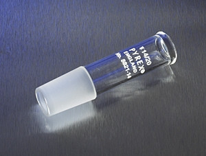 These Pyrex® thermometer adapters have a 24/40 Standard Taper ground joint at one end while the other end is tooled to accommodate a thermometer. The adapter comes with a rubber thermometer holder. For replacement rubber thermometer holders, see No. 7715. This tube is also a replacement part for Corning® organic chemistry kit No. 6949.