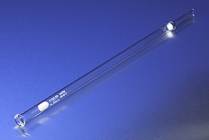 These Pyrex® columns are designed for general chromatographic analysis. The tops are tooled for a rubber stopper fit and the tubes are fabricated with sealed-in coarse porosity (40 to 60µm) fritted discs. The outflow tubes are large in diameter to eliminate the smearing of the definition bands of effluent caused by the tube being filled and the solvent mixed before being expelled. The outflow tubes are long enough to protrude through a rubber stopper.